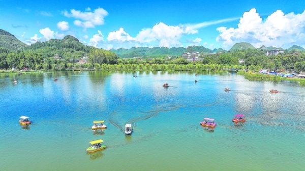 游客在安龙招堤国家湿地公园内乘船观光 通讯员 刘朝富 摄